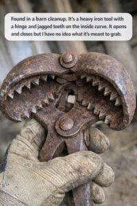 During a cleanup, someone might come across a heavy iron tool with a hinge in the center and sharp, evenly spaced teeth along the curved inside edges.